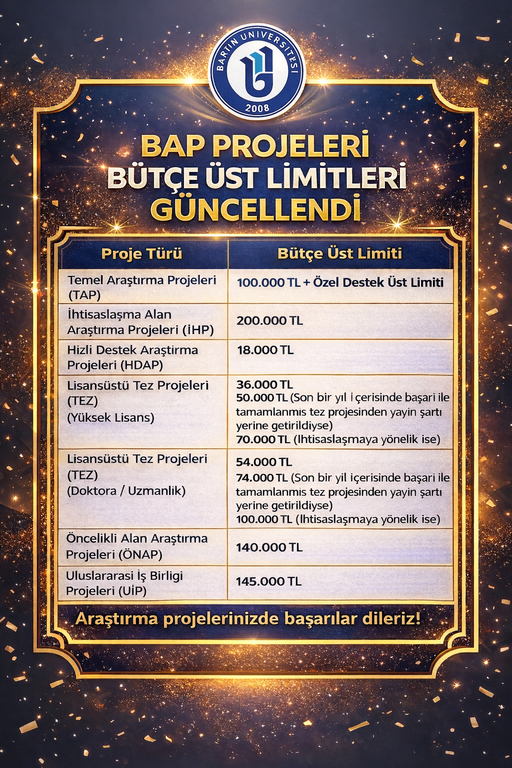 Üniversitemizde yürütülen bilimsel araştırma faaliyetlerinin daha güçlü şekilde desteklenmesi amacıyla, Bilimsel Araştırma Projeleri (BAP) Komisyonu tarafından 2026 yılı için proje bütçe üst limitleri güncellenmiştir.