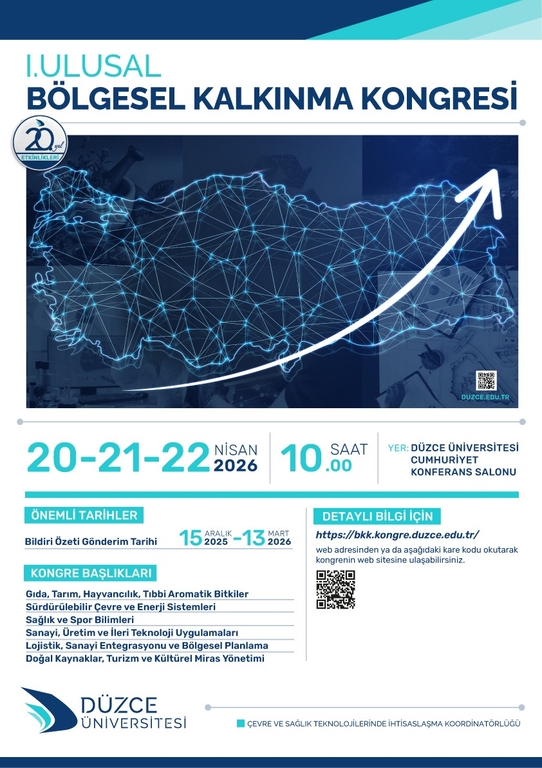 Düzce Üniversitesi Çevre ve Sağlık Teknolojilerinde İhtisaslaşma Koordinatörlüğü tarafından 20–22 Nisan 2026 tarihlerinde düzenlenecek olan “1. Bölgesel Kalkınma Kongresi” için bildiri özetleri kabul edilmeye başlanmıştır. Bu kongre; YÖK tarafından ihtisaslaşma alanları belirlenmiş 26 üniversitenin katılımıyla, ülkemizin çeşitli bölgelerinde yürütülen bölgesel kalkınma odaklı akademik, teknolojik ve sektörel çalışmaların paylaşılacağı ilk ulusal platform olma özelliğini taşımaktadır.
