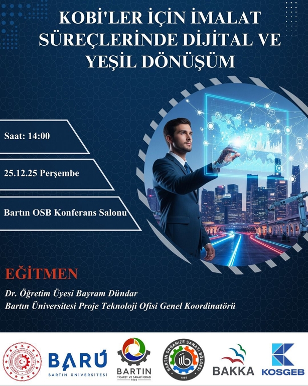 KOBİ’ler İçin İmalat Süreçlerinde Dijital ve Yeşil Dönüşüm başlıklı konferans, Dr. Öğr. Üyesi Bayram DÜNDAR’ın eğitmenliğinde gerçekleştirilecektir. Konferansta, KOBİ’lerin imalat süreçlerinde dijitalleşme ve sürdürülebilirlik odaklı yeşil dönüşüm uygulamaları ele alınacaktır. Etkinlik, 25 Aralık 2025 tarihinde saat 14.00’te Bartın OSB Konferans Salonu’nda düzenlenecektir. Katılımlarınızı bekliyoruz.